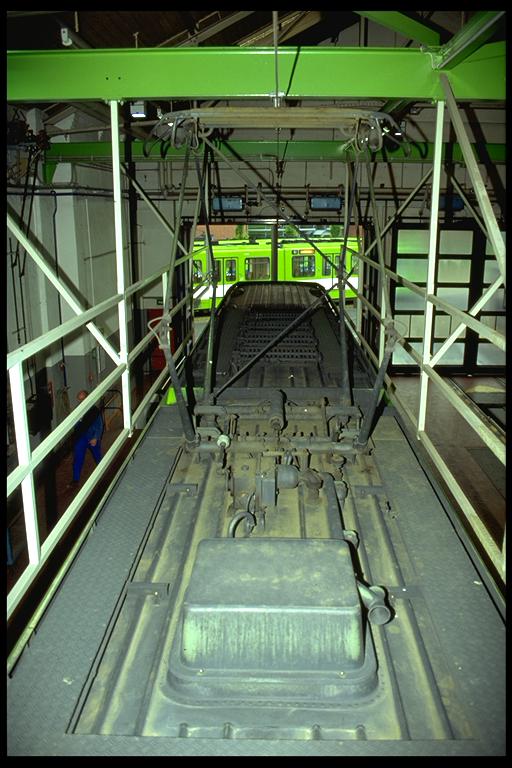 Die Steuerung selbst geschieht über Steckkarten im Wagensteuergerät, das unter der Klappe im M-Wagen in Richtung A-Wagen eingebaut ist, da wo der Entwerter nicht ist. Sie umfaßt u. a. auch Gleit- und Schleuderschutz und Gewichtsauswertung. Ersteres wird über Winkelschrittgeber kontrolliert, letzteres über Gewichtsmeßzellen in den Drehgestellen. Das Wiegen dient auch zur Kontrolle der Ruckbegrenzung, da die Änderung der Beschleunigung beim Anfahren auf 1,1 m/s3 beschränkt ist. Abweichend von dieser Ausstattung verfügen die Fahrzeuge 6206-6260 über eine Mikroprozessorsteuerung mit einem 8085 und GTO-Thyristoren, die Elektronik besitzt eine interne Fehlerdiagnose. Wegen dieser Elektronik waren die hohen 6000er in der Nacht zum Jahr 2000 ebenso wie alle TW 2000 sicherheitshalber abgestellt. Außerdem gibt es bei 6001-6004 noch Unterschiede gegenüber den späteren Serienfahrzeugen. Zu der Elektrik gehören ferner zwei parallel geschaltete Netzkondensatoren von je 2,5 mF und zwei Netzdrosseln vom Typ LFD 380 mit je 2 mH. Die Netzdrosseln wiegen zusammen mit der Motordrossel bereits 145 kg. Bei den Thyristoren handelt es sich um BGT S 2000 A 22-11 für maximal 2200 V und 2 kA, die Bremsvorwiderstands- und Kurzschlußthyristoren sind vom Typ T 709 N 2200. Als Dioden werden D 668 N 2200 T, D 799 S 2000 T und D 384 S 1800 T eingesetzt. Auch wenn der Autor sozusagen E-Techniker ist: die Datenblätter von Siemens hat er nicht parat, aber vielleicht interessiert es ja jemanden ;-) Ein Gleichstromsteller allein wiegt 140 kg, der gesamte Gerätecontainer 700 kg. Die Steuerung über zwei unabhängige Motorstromkreise erlaubt die Abschaltung eines fehlerhaften Kreises. Leider reicht die Leistung einer halben Stadtbahn nicht aus, um sie vollbesetzt die Rampen hochzubekommen. Zur Stromabnahme dient ein Scherenstromabnehmer auf dem M-Wagen, der weitmöglichst in Richtung A-Wagen versetzt ist.