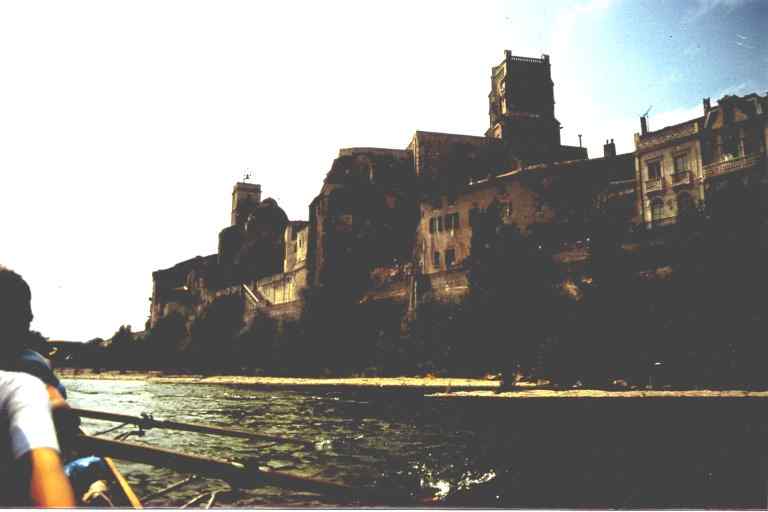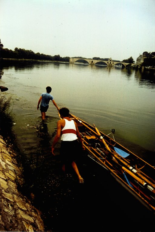 Am nächsten Tag sollte dann Avignon erreicht werden. Leider erreichten wir zunächst die Schleuse vor der Stadt, und zwar gegen 18:30 Uhr. Monsieur l'éclusier hat aber um 19:00 Feierabend, das reicht nicht zum Füllen und Leeren der Schleuse. Wir nutzen dafür den gepflegten Rasen vor der Schleuse und marschierten - warum, weiß ich nicht mehr - am nächsten Tag in Avignon ein, gegenüber der berühmten Brücke ist ein Campingplatz, den wir aufsuchten.