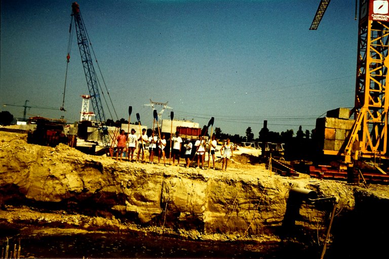 Der hinzukommende Wachposten der Baustelle schickte uns nicht etwa fort, sondern schloss uns sogar noch das WC-Häuschen auf! Zum Dank hier ein Gruppenfoto mit Grube: