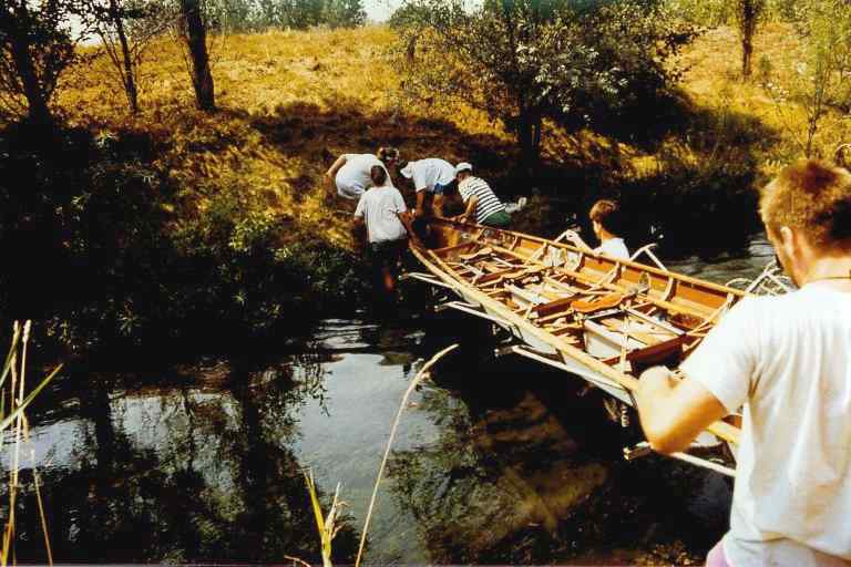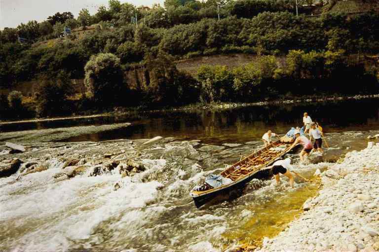 Der Oberlauf der Rhône hat nun leider den Nachteil einiger Staustufen, die grundsätzlich keine Schleuse oder auch nur eine Umtragemöglichkeit besitzen. Die Tragestrecke ging teilweise an einen halben Kilometer, und das mit schweren Plastikkähnen. Bei einer Gelegenheit haben wir abgekürzt und die Boote vom Wehrkanal in den Altarm getragen. Aus irgendeinem unerfindlichen Grund lag dazwischen allerdings ein tiefer Graben ...
