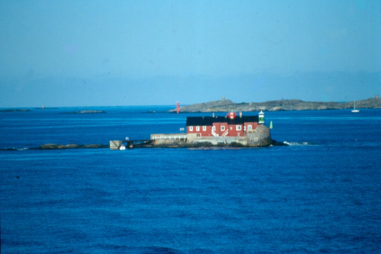 Hier ist noch mal ein Größenvergleich Fähre-Insel, mit einer Insel weiter draußen. Selbst ohne den Schornstein schwimmt da bereits ein Hochhaus vorbei.