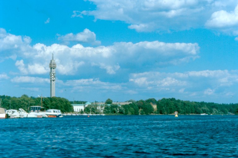 Stockholms Roddförening liegt an einem Gewässerarm, der Djurgården (die Tiergarten-Insel) vom Festland trennt, unweit vom Kaknäs-Turm. Dieser ist das höchste Gebäude Skandinaviens, ziemlich genau halb so hoch wie der hannoversche Fernsehturm "Telemax". Den Arm sieht man rechts am Bildrand nach hinten verschwinden. In der Bildmitte die chinesische Botschaft. An die Geschwindigkeitsbegrenzung (7) hält man sich auf dem Wasser offenbar noch seltener als im Straßenverkehr an Land. Allerdings gilt sie auch nur bis kurz vor das Bootshaus, und das, obwohl direkt am Verein eine Brücke und eine Biegung ist - einspuriger Verkehr ohne Sicht.