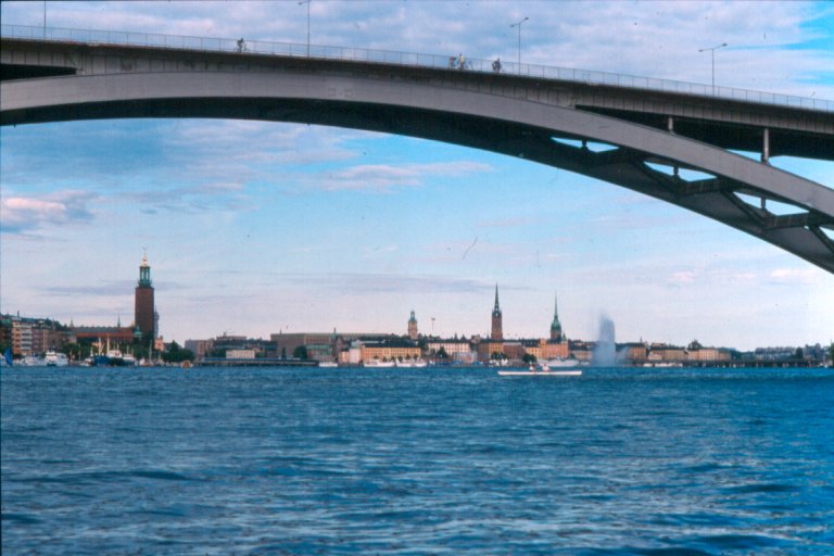 Nähert man sich Stockholms Innenstadt aus Richtung Drottningholm, dann kommt man an dieser Stelle vorbei. Links das große Stadshuset (Rathaus). Geradeaus Riddarholmen, hinter dem schon die eigentliche Innenstadt Gamla Stan liegt. Links kann man eine Brücke mit U-Bahn erahnen. Rechts Slussen, wo sich die Schleuse und damit der Übergang von Mälaren zur Ostsee und damit die (theoretische) Grenze von Süß- und Salzwasser befindet. Die große Fläche auf dem Bild nennt sich Riddarfjärden.