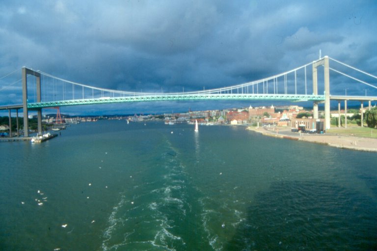 Und dies soll auch symbolisch der Abschied aus Schweden sein: die Stena Germanica verlässt den Hafen von Göteborg. Zwischen dem Schornstein der Fähre und der Brücke ist nicht sehr viel Platz, was wieder einmal zeigt, wie hoch so ein Schiff ist. Siehe auch die Häuser am Ufer und das Segelboot.