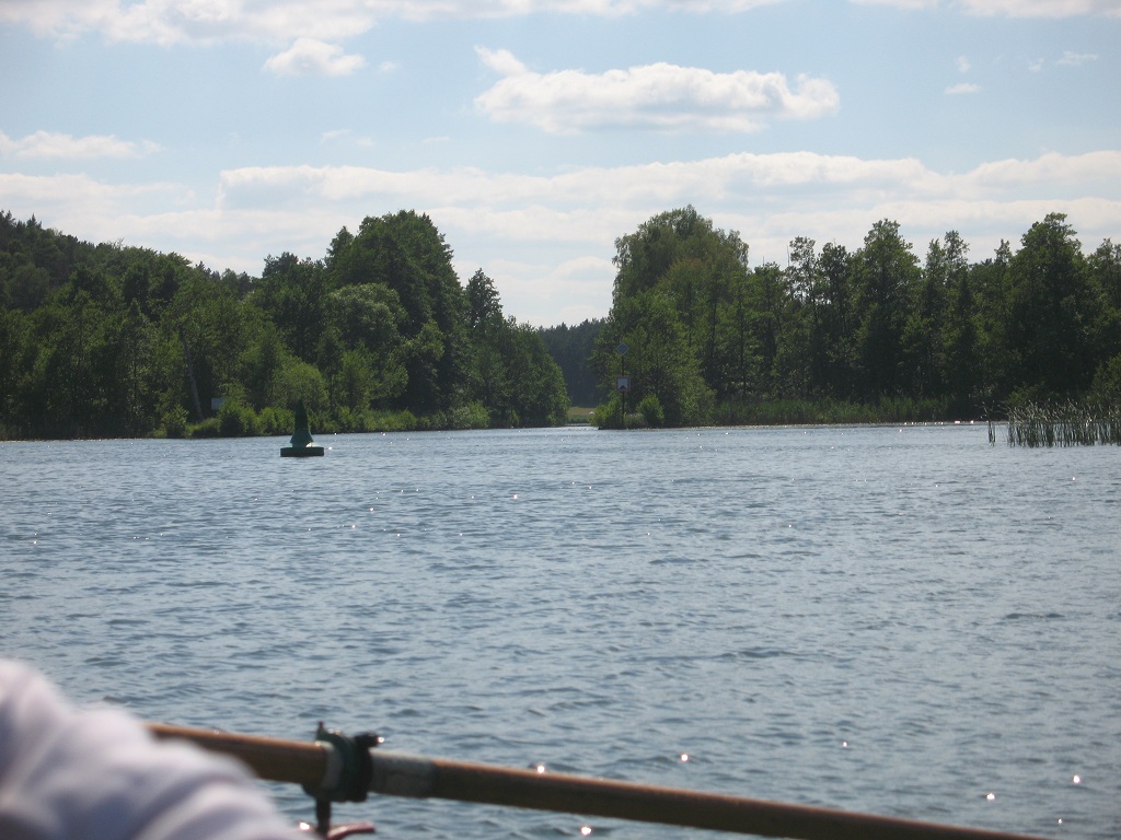 Von der Rückfahrt nach Flecken Zechlin noch zwei Bilder. Zwecks Vereinfachung der Organisation halten wir es die gesamte Woche über so, dass wir abends mit den Booten zum Bootshaus zurück kehren. Das erspart die Rödelei mit Autos oder anderen Verkehrsmitteln (wobei der Bahnanschluss von Rheinsberg nach Flecken Zechlin schon 1945 stillgelegt wurde) und erlaubt die tägliche Anpassung der Bootsplätze an die Zahl der Ruderwilligen (bzw. -fähigen).