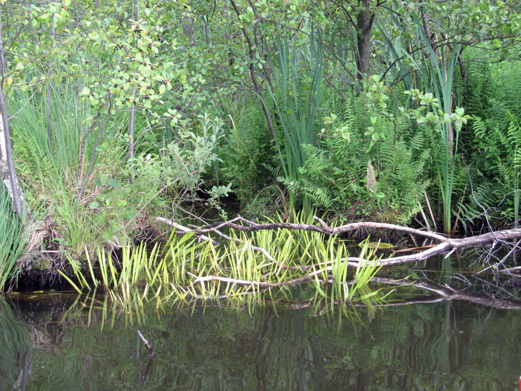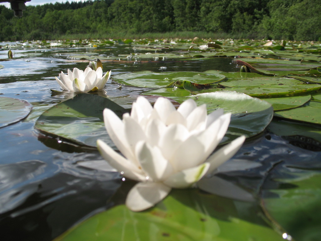 Besonderes Augenmerk liegt dabei natürlich auf den Seerosen, denen wir Ungemach ersparen. Zum Glück gibt es in Verlängerung des in den Bikowsee mündenden Baches eine Schneise, in die wir mit Auguste hinein passen, ohne Pflanzen zu überfahren. Hier die Weiße Seerose Nymphaea alba.