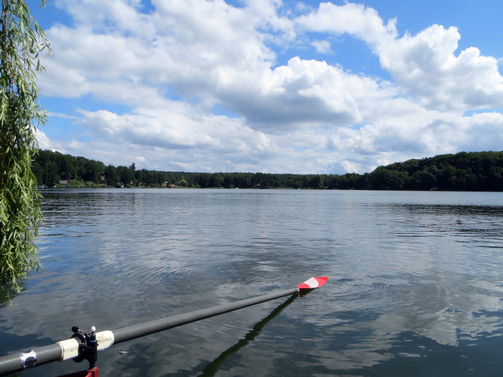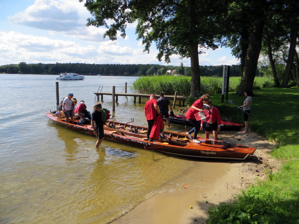 22. Juli 2012: Die Sonne lacht uns morgens an. Nach dem eher schlechten Wetter der letzten Wochen macht das Hoffnung auf eine trockene Woche. Da noch nicht die gesamte Mannschaft vor Ort ist, ist erst einmal eine kleine Runde zum Warmfahren geplant. Zuerst geht es aber in Richtung Flecken, um dort eine Mitruderin direkt aus dem eigenen Garten abzuholen. Unter bzw. sogar in der Weide angelegt, gibt es zur Begrüßung erst einmal einen Becher Wein.