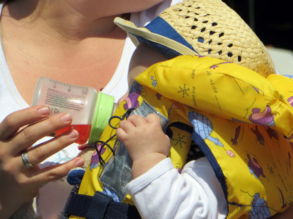 Unser Nachwuchs ist natürlich nicht nur korrekt verpflegt, sondern an Bord auch entsprechend gesichert. Allerdings schränkt eine Schwimmweste die Bewegungsfreiheit und auch die Sicht ein wenig ein.