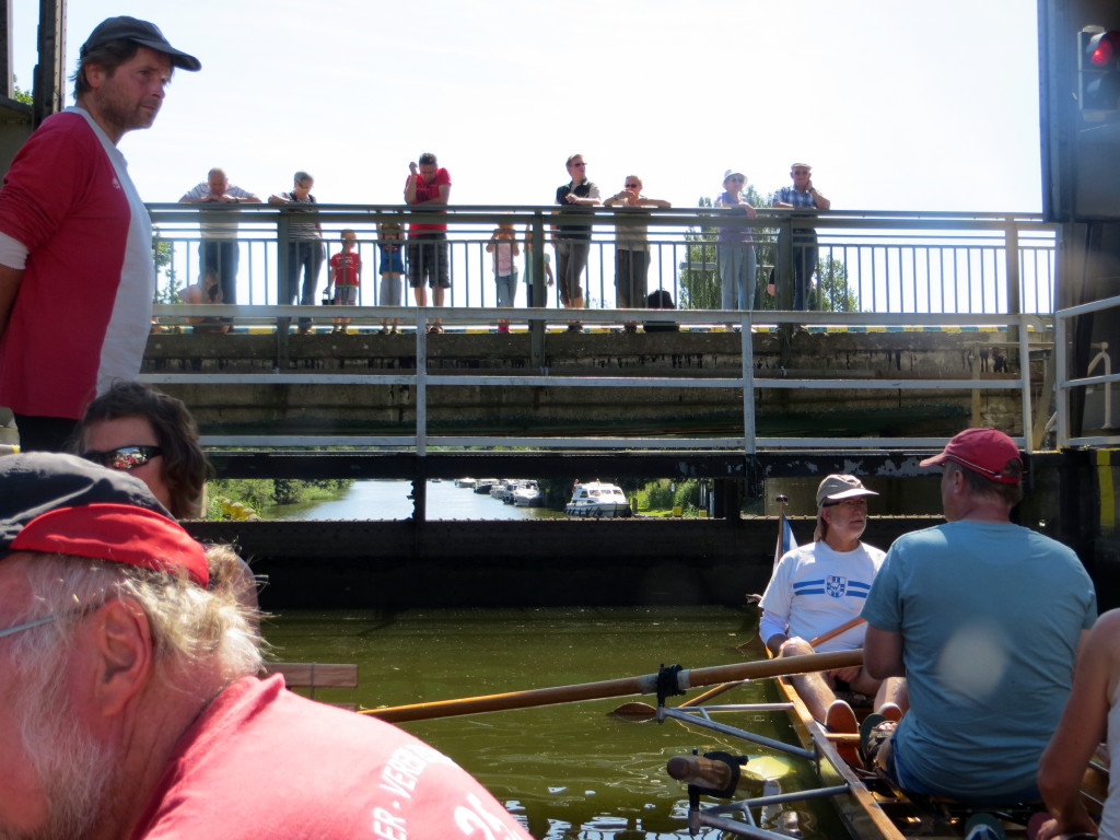 Auch die nächste Durchfahrt ist wieder eng und - was uns weniger stört - auch flach, aber natürlichen Ursprungs. Es geht in den Nebel. Das Sportboot hinter uns hat nach einigen Umbauarbeiten ebenfalls die niedrige Brücke geschafft. Wir aber legen an und gehen an der Badestelle Krümmel Schwimmen.