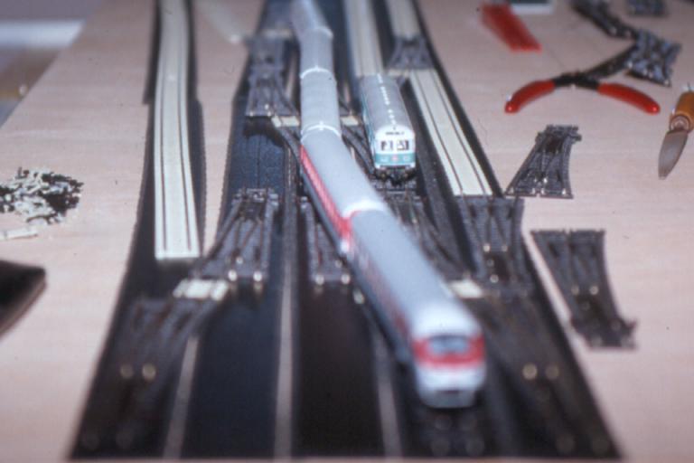 Die ersten Gleise sind bereits abgelängt, in einem ersten Versuch wird der Eindruck eines über die Weichenstraße fahrenden Zuges geprüft. Die Gleise und auch die Gleisbettungen von Woodland sind zu diesem Zeitpunkt nur lose aufgelegt und nicht ausgerichtet.