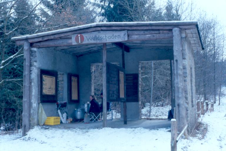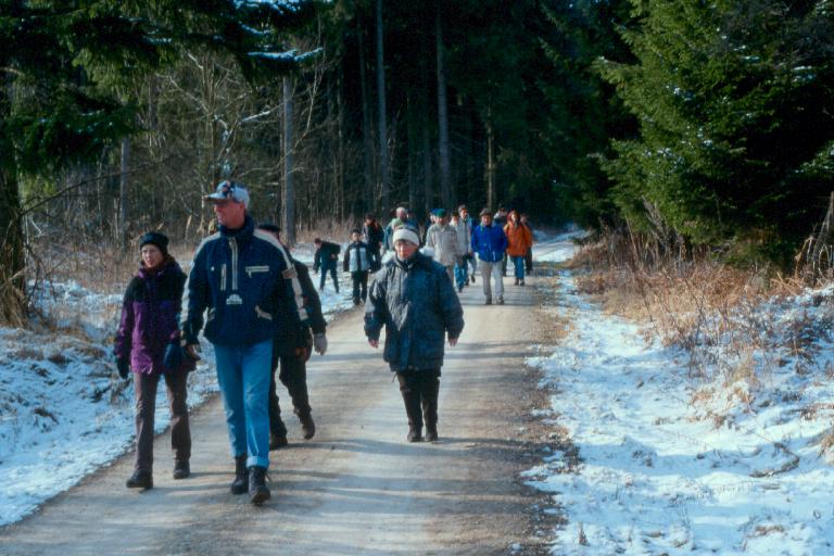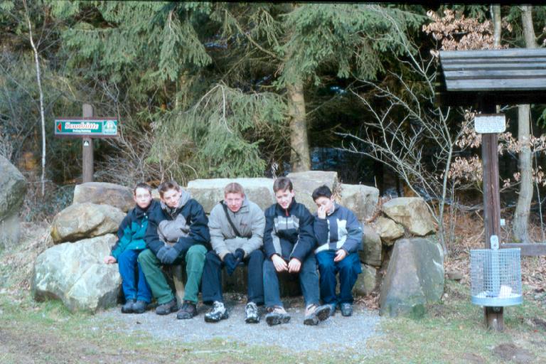 Nun wieder beisammen ging es erneut bergauf und dann wieder in langsam bergab. Allmählich regte sich bei allen der Appetit, ganz abgesehen von den Youngsters, die geglaubt hatten, sie würden auf der gesamten Tour mit Schokoriegeln gemästet. Doch beim verabredeten Treffpunkt, dem Parkplatz am Beginn des Weges zur Sennhütte, war kein "Landdienst" zu finden. Dank der so oft verschmähten modernen Kommunikationsmittel konnte der Hirsch mit dem letzten Zentimeter Reichweite wenigstens Tobi auf die Mobilbox sprechen, dass wir ihn nicht fänden. Heinz-Willi, nach Genuss einer Tafel Schokolade und einer Tüte Gummibärchen noch gut in Form, hatte unterdessen den Weg bis zur nächsten Biegung bewältigt und dort einen wesentlich ruhigeren Parkplatz und eine Waldschadens-Informationshütte entdeckt.